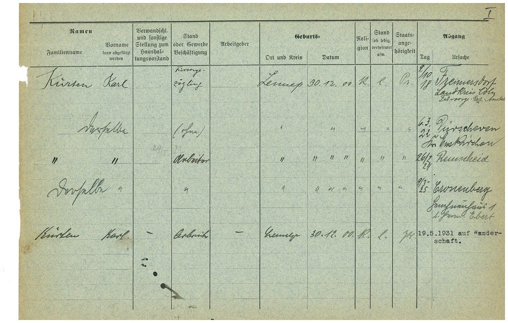 Karl Kürtens Mutter Bertha war im Mai 1922 verstorben, so dass der junge Mann kein Zuhause mehr hatte, in das er zurückkehren konnte, und so bezog er 1924 eine eigene Wohnung in der Hackenberger Straße. Ein Jahr später wechselte Karl wieder die Stadt: Er verzog Anfang März 1925 nach Wuppertal-Cronenberg und fand Unterkunft (und anzunehmenderweise) Anstellung beim Cronenberger Fuhrunternehmer Hermann Ebert.